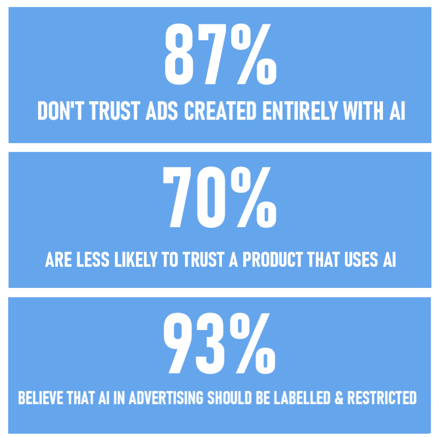 Canadians in particular don’t trust AI, with an Angus Reid poll finding that 70% are less likely to trust a product that uses AI, and 93% believing that AI used in advertising should be labelled and restricted.